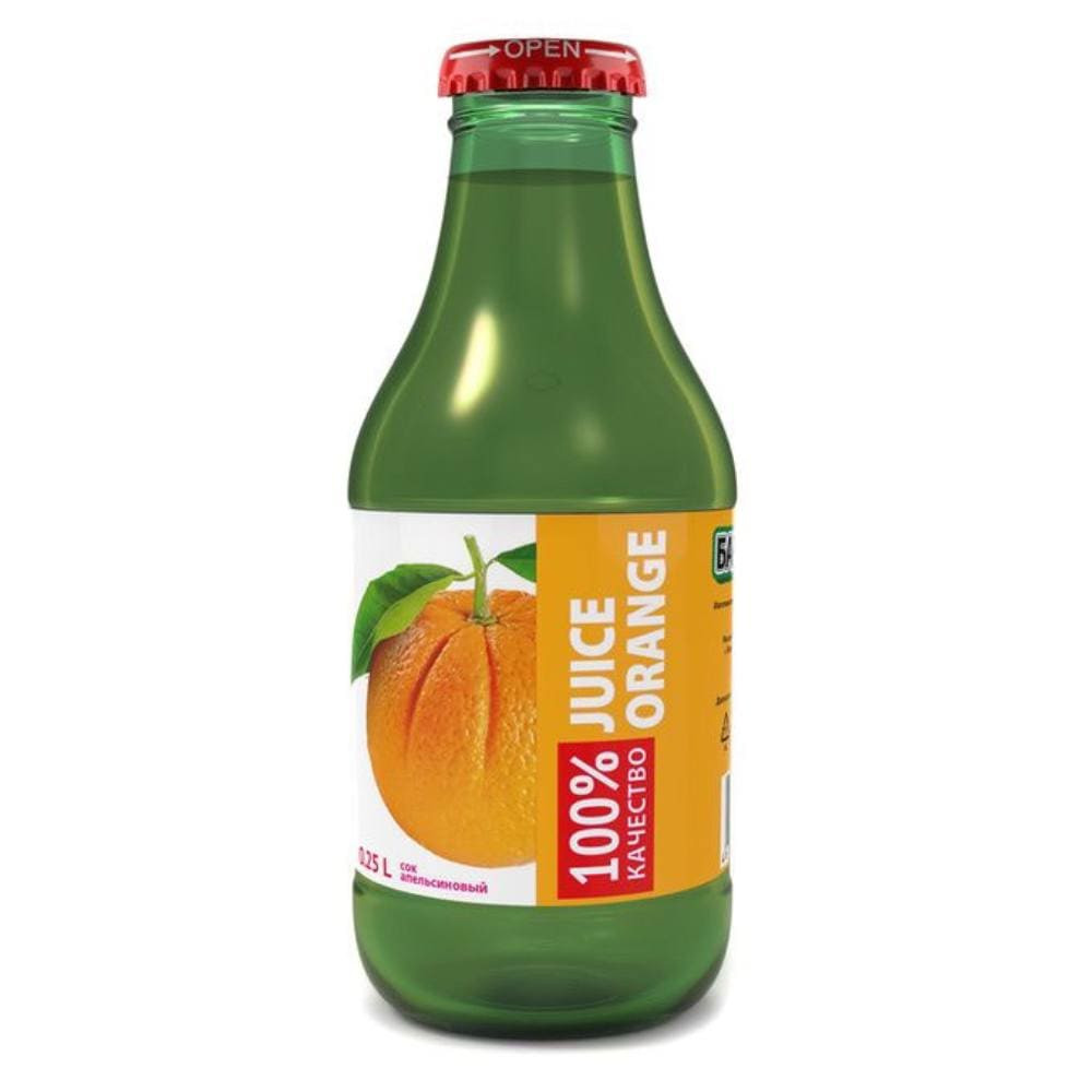 Сок апельсиновый восстановленный с мякотью ст/бут (0,250 л/0,440 кг) 12 шт/упак Barinoff